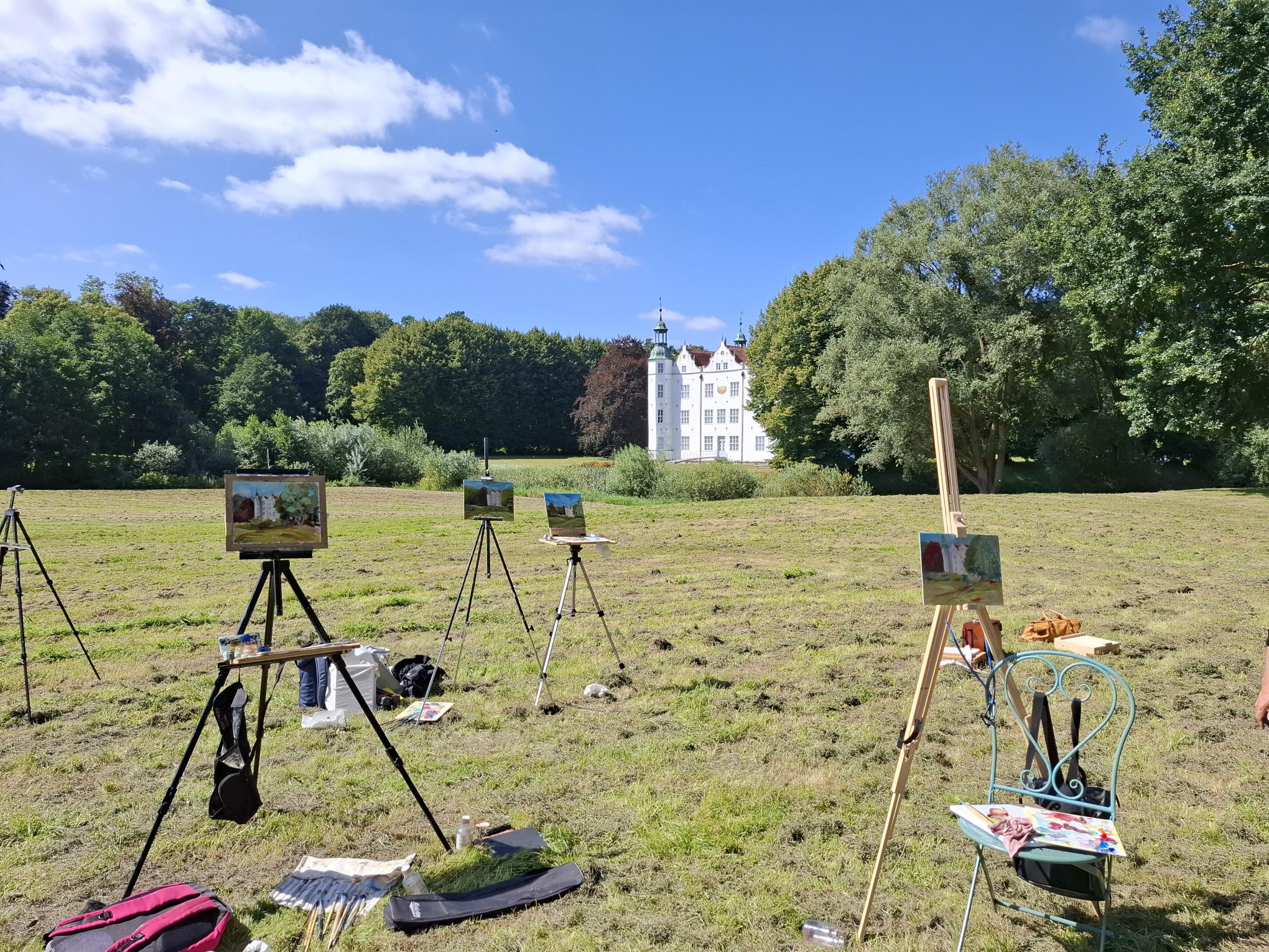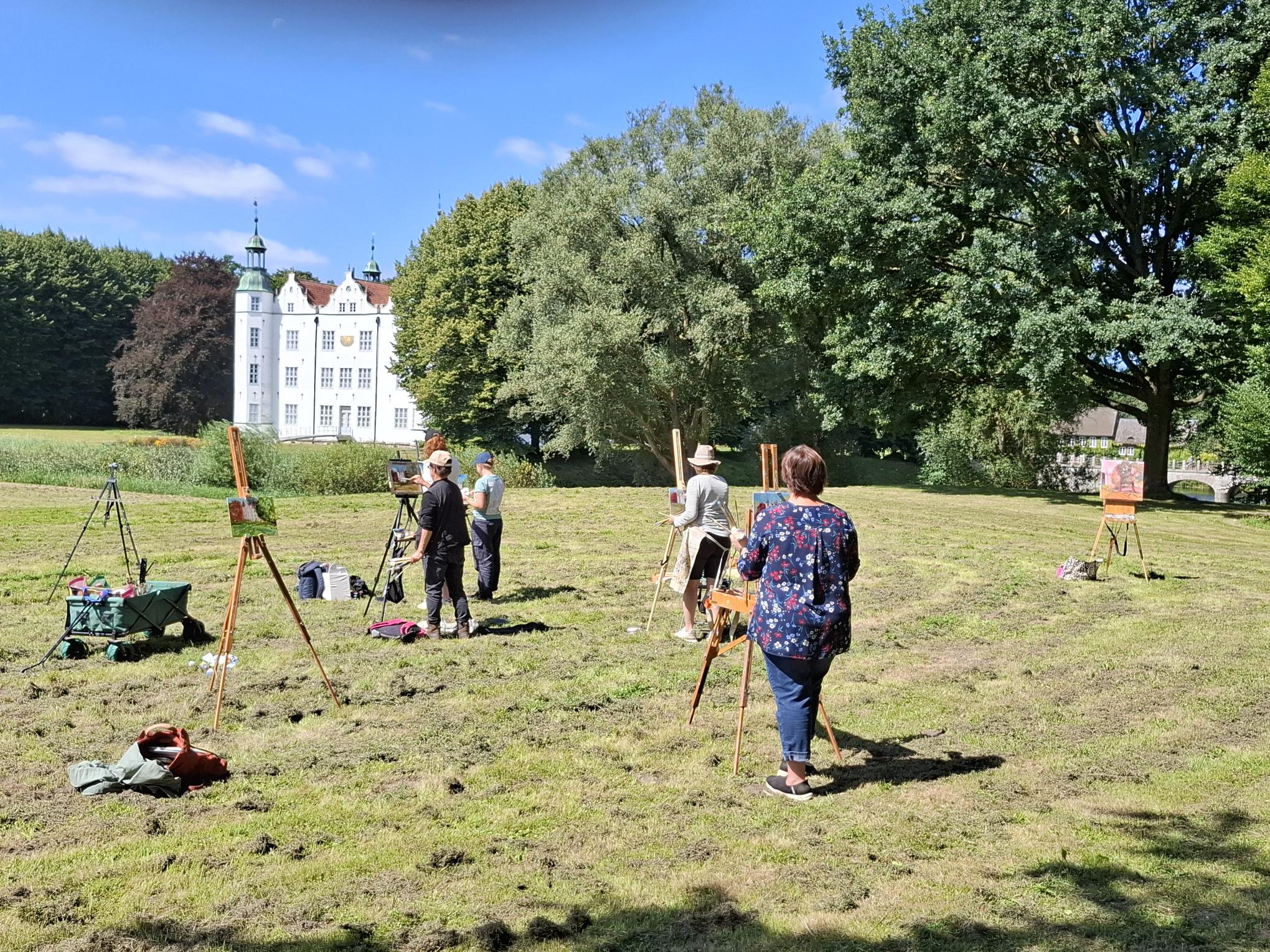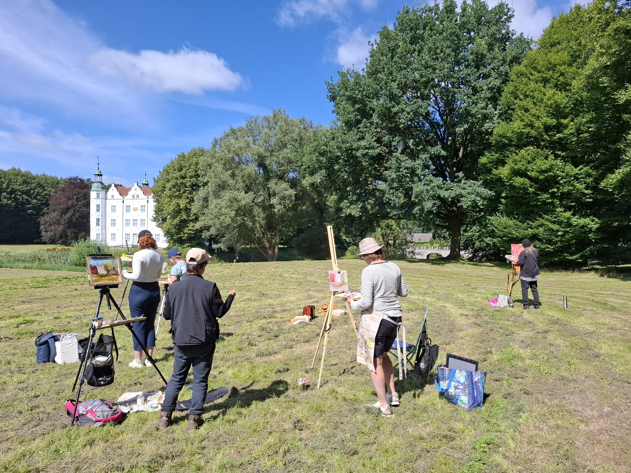 im Schlossensemble in Ahrensburg von 11 bis 14 UhrSeit Erfindung der Ölfarben in Tuben ziehen die Maler und Malerinnen in die Natur um in der alla prima Technik (Bild wird in einer Sitzung fertiggestellt) Studien oder auch größere Gemälde zu schaffen.