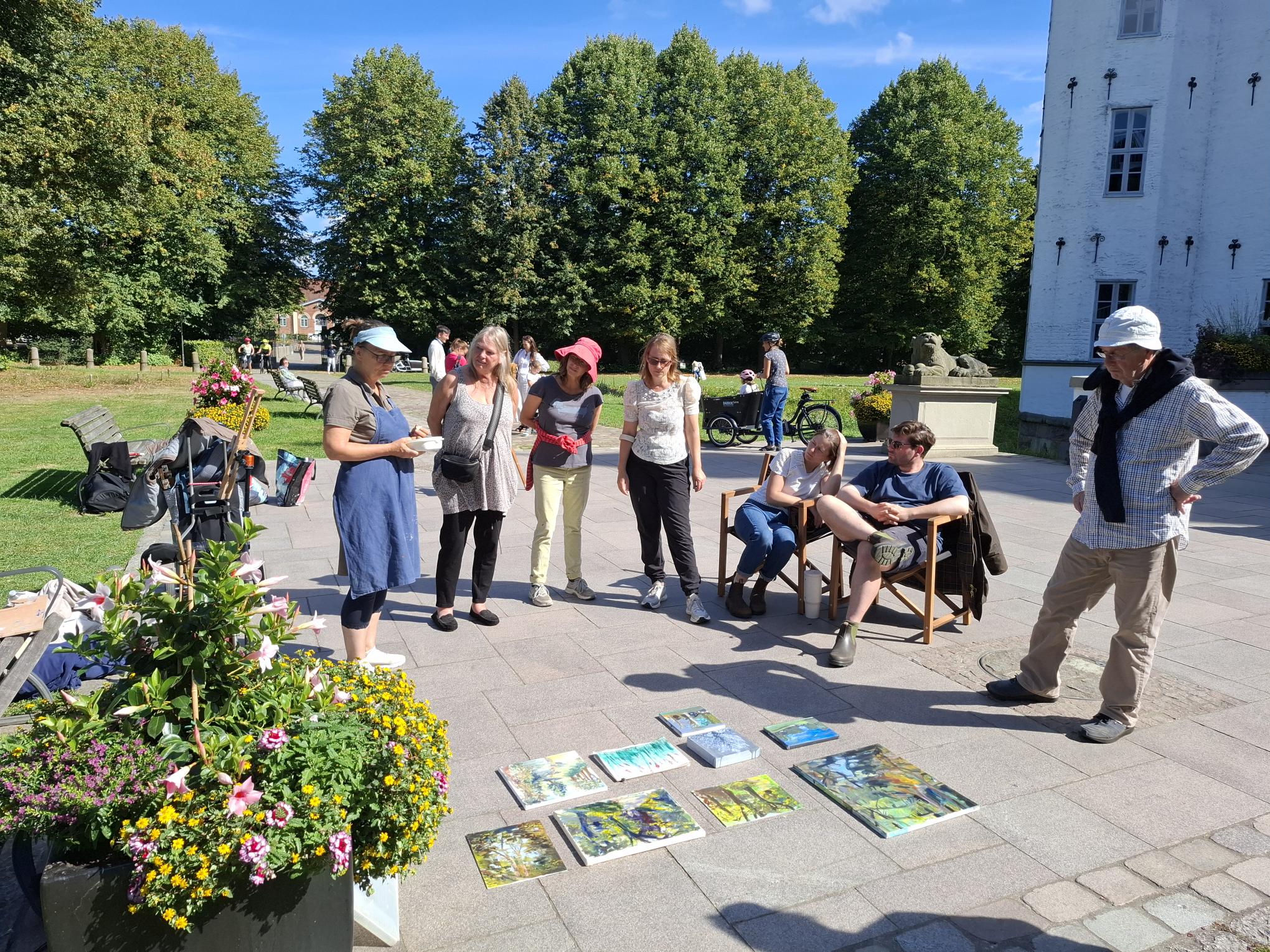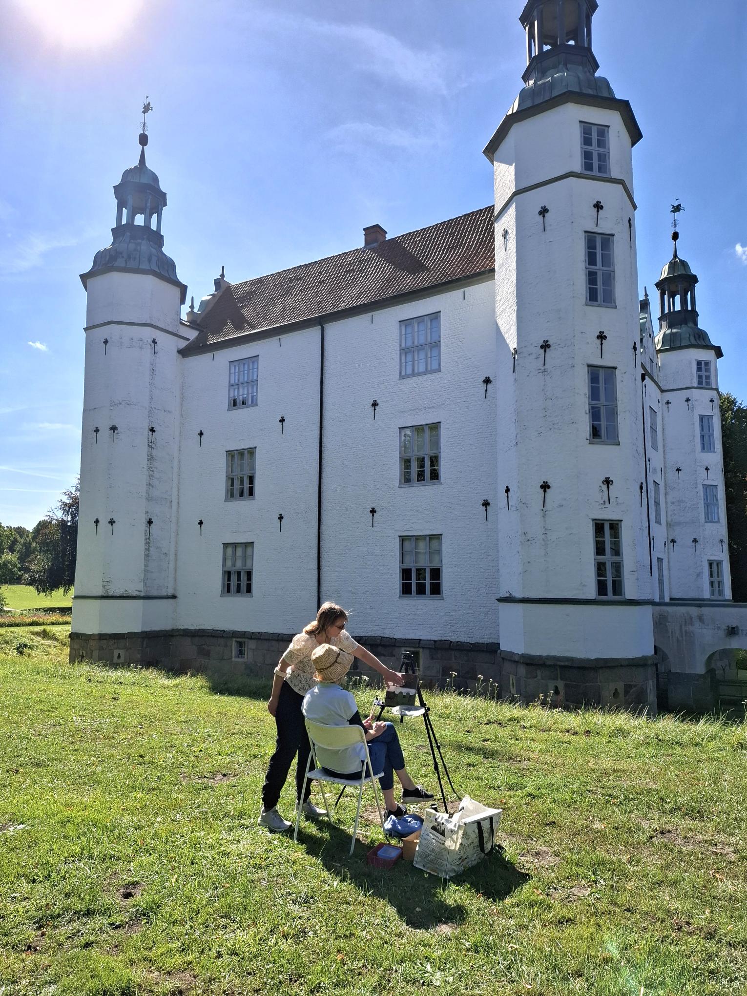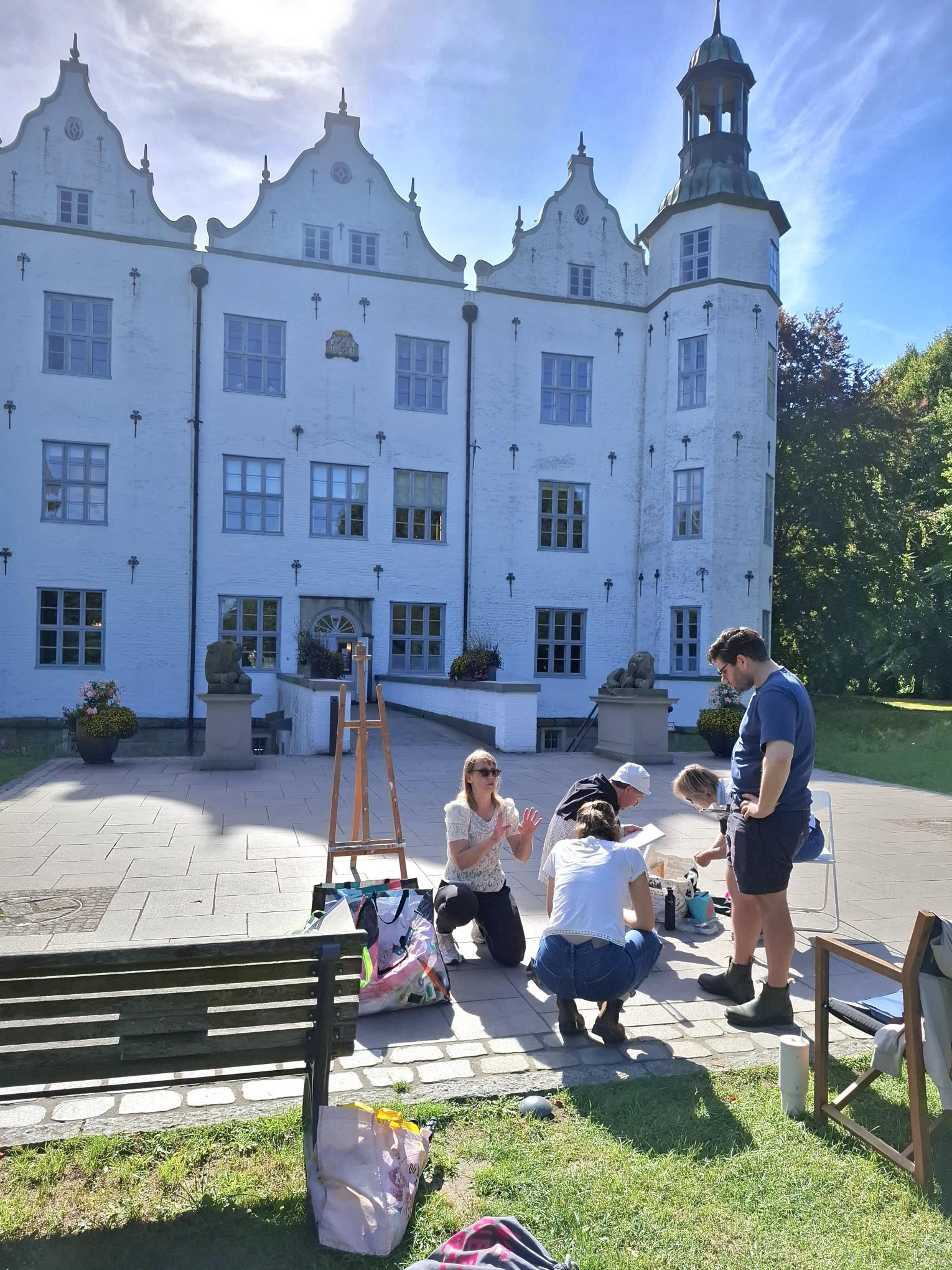 Zu Beginn des Workshops findet eine Mal-Demonstration mit Ölfarben statt – als Motiv dient das Schloss selbst. Dabei werden sowohl Materialien und Zubehör als auch grundlegende Aspekte der Ölmalerei erläutert.