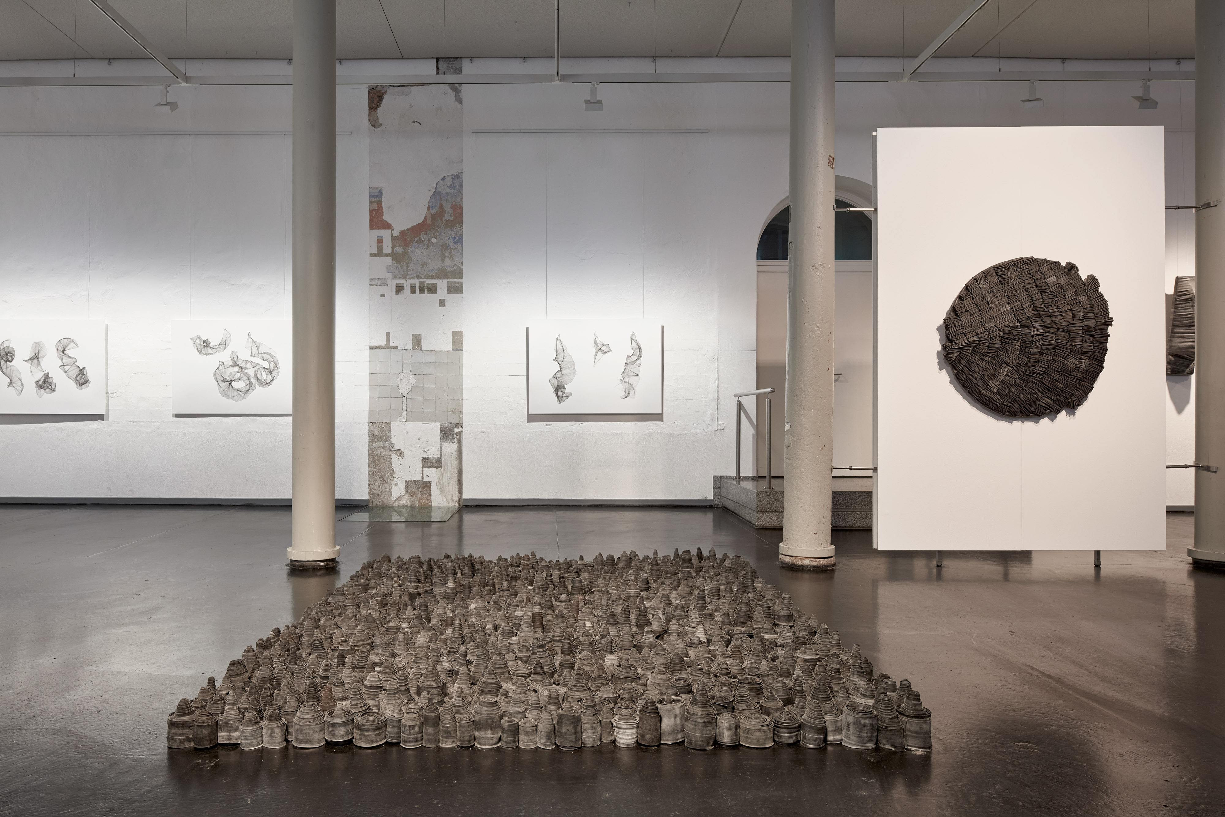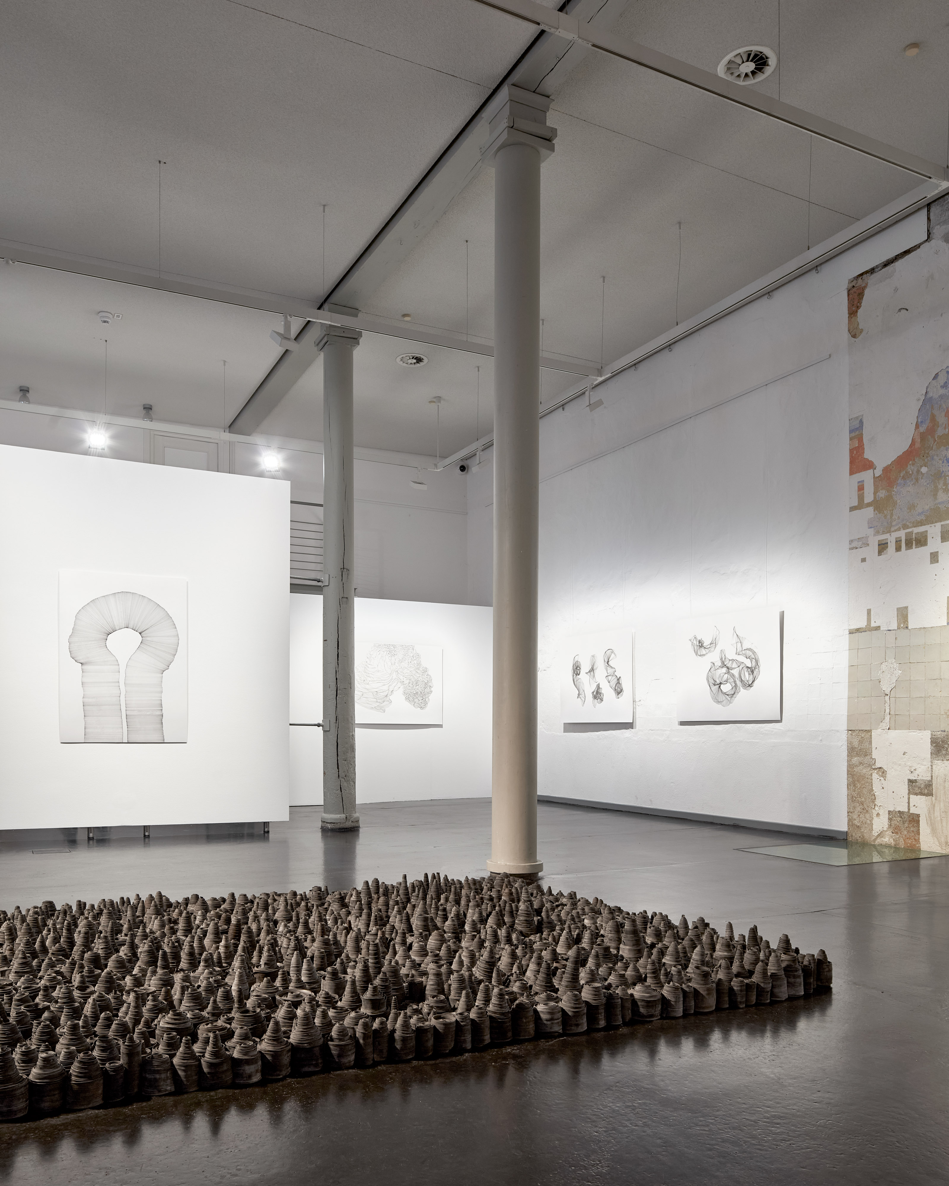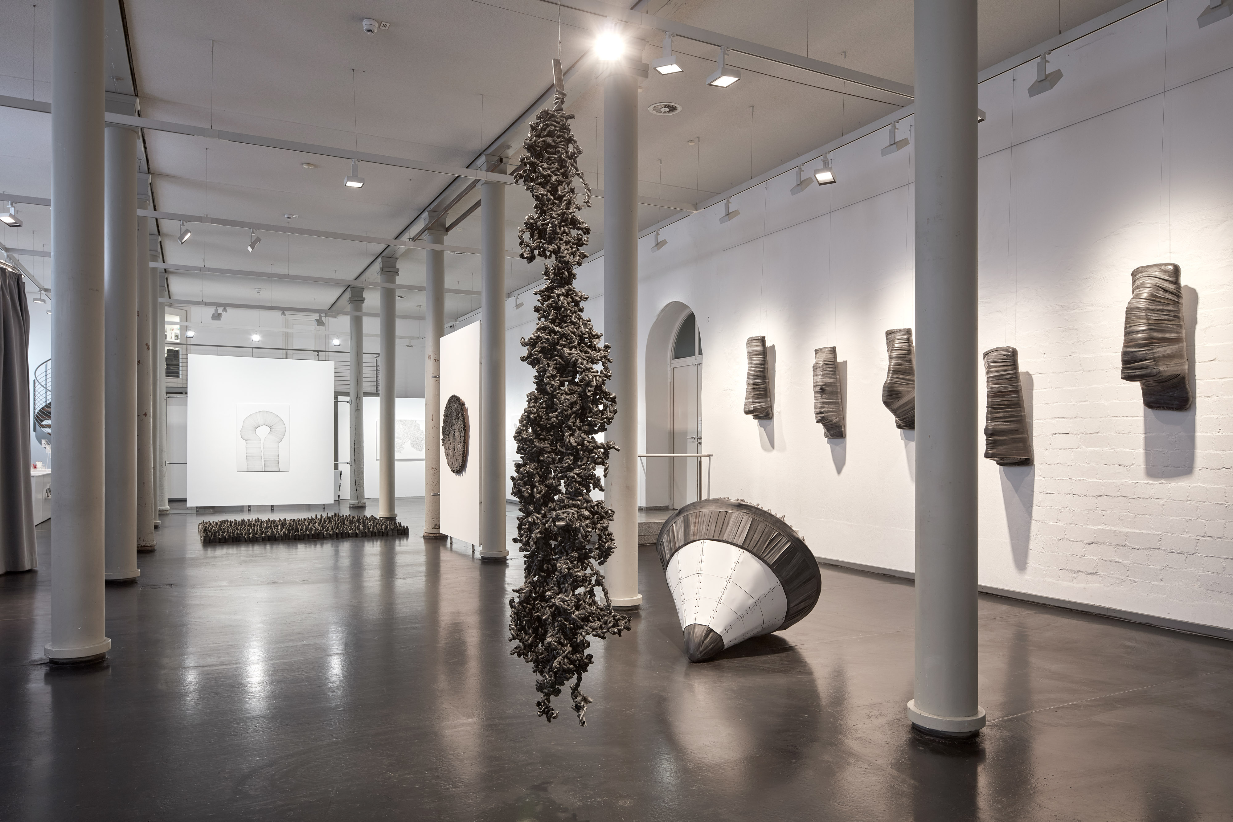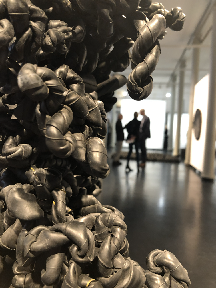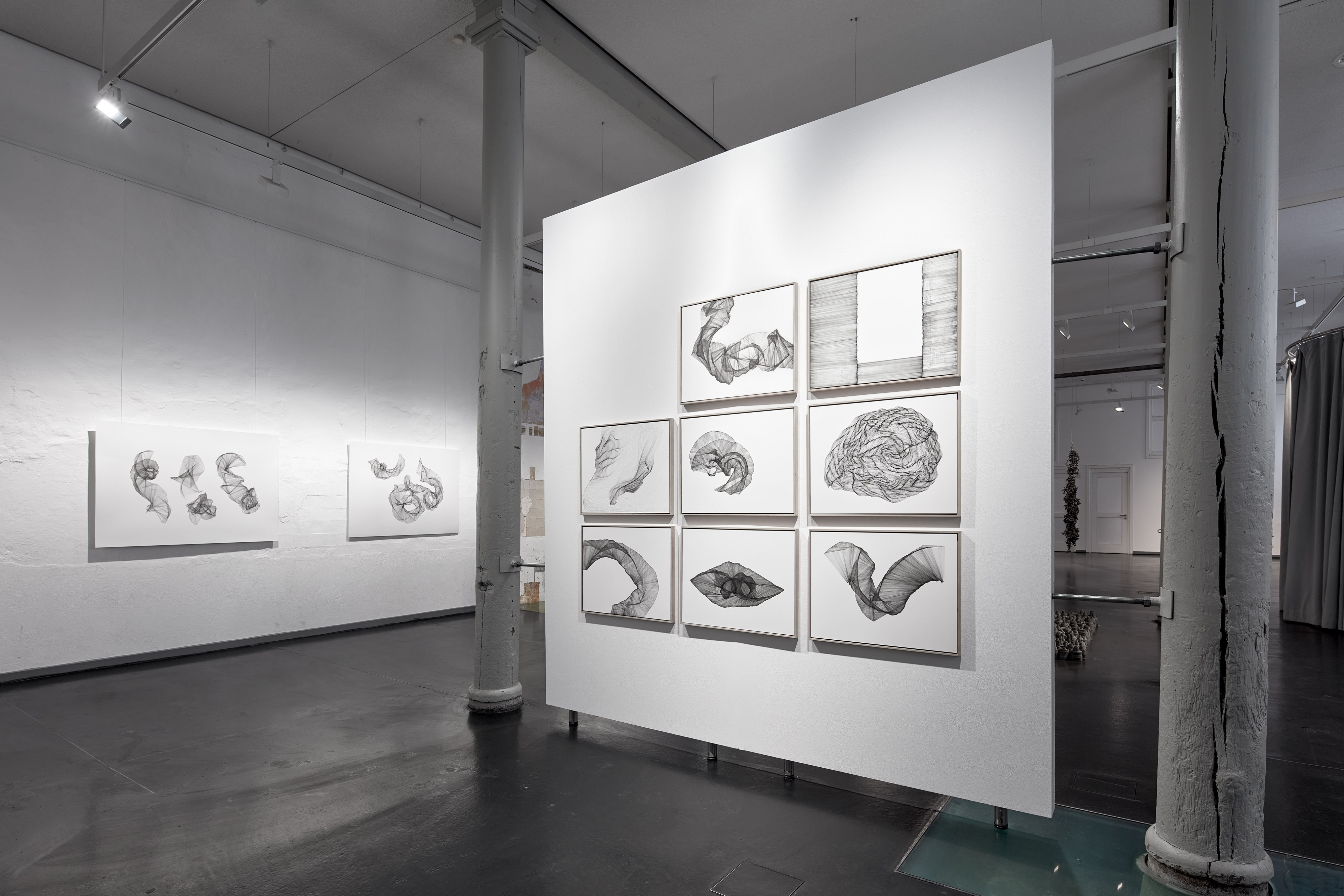 Wiederholung ist das zentrale Prinzip. Sie strukturiert die Zeichnungen und Objekte, spiegelt aber auch menschliche Routinen, kollektives Verhalten und kulturelle Muster. Zwischen individueller Geste und Schwarmintelligenz, zwischen Intuition und Algorithmus, zwischen Zufall und Regelhaftigkeit entsteht eine Dynamik, die den Arbeiten ihre Prägnanz gibt. Falks Materialien – seit 2020 insbesondere gebrauchte Fahrradschläuche – werden aus ihrem ursprünglichen Zweck gelöst und in neue ästhetische Zusammenhänge überführt. Durch Schneiden, Falten, Rollen, Ziehen entstehen Objekte, die Raum einnehmen, verdrängen und zugleich neue Räume eröffnen.